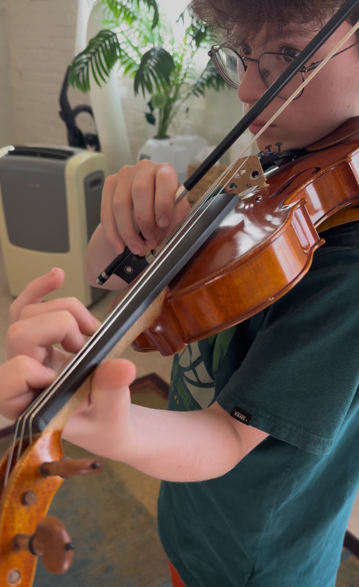 Take care of your violin: keep it away from temperature extremes, (don’t store by a heater, or leave in a cold car) and be gentle with it so that it doesn’t get knocked out of tune. (I will teach you how to tune, in case it does.) Loosen your bow a bit when you put it away. We will go over in class how to put it in the case. You can store it at home in a safe place outside of the case if it makes practicing easier.